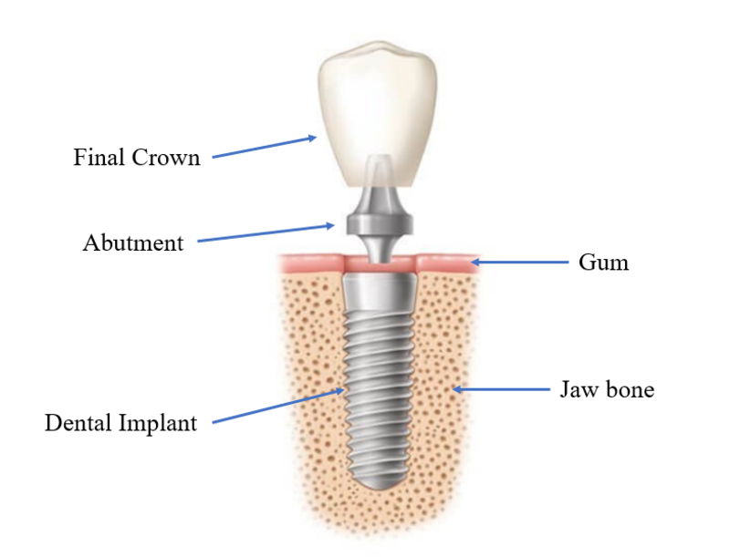 There are 3 main components to every dental implant: crown, abutment, and implant. The crown is the tooth that you see. The abutment is the connecting piece that links the crown to the implant. These three components are made to fit together with absolute precision and held together with a gold or titanium screw (not pictured).